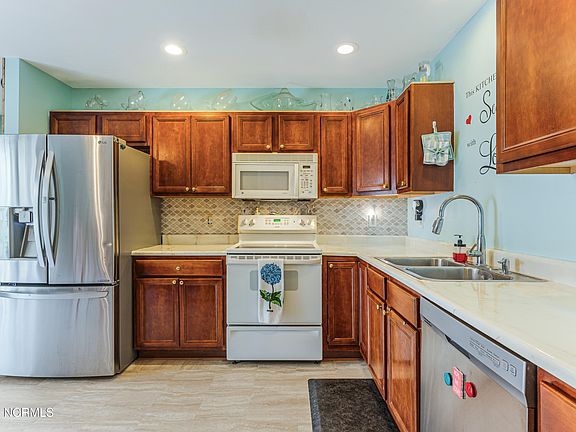 The kitchen is a highlight, featuring a stainless steel refrigerator and dishwasher, new Formica countertops, and laminate flooring for a modern yet functional space. The primary bedroom is spacious enough for a king-size bed and includes its own private en suite bathroom, ensuring a comfortable and convenient retreat. Two additional bedrooms and a full bathroom provide ample space for family or guests.