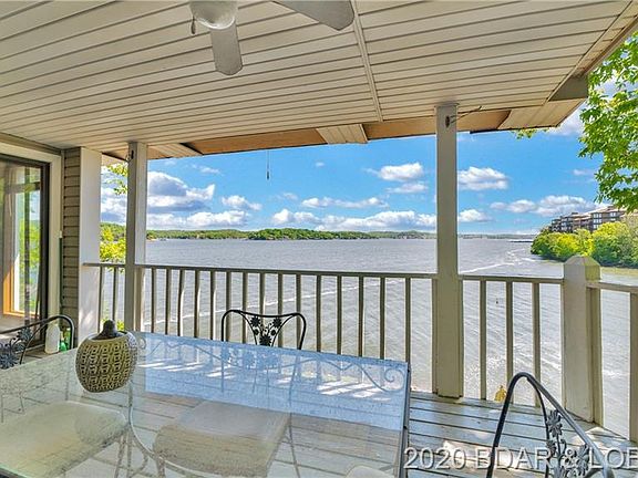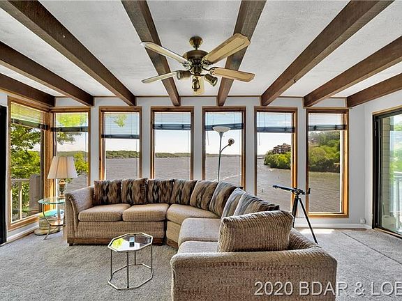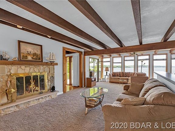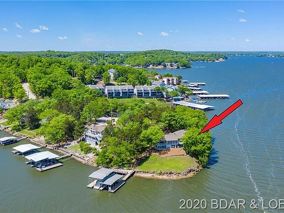 Diamond in the rough with tremendous potential. 344' fabulous Lakefront in Lake Ozark on popular Horseshoe Bend. This home has been loved by this family for many years. Original bld in 70's and added on later. Use your imagination and your fixer upper skills to make this your family home for the next several decades. Priced at just $103/sqft, it is a bargain and is being sold "AS IS" with no warranties or guarantees by family that has never lived there. Layout is great with two bedroom suites and a third bedroom and bath on the main level, and two additional bedrooms with two baths on lower level, (one being a master). Kitchen is open to a hearth room with dining area, plus another large living/dining room with walls of windows. Cruiser dock and 16x40 martini deck at lakeside along with a hot tub room complete the package. Located on the point at the four mile mark, and at the end of a cul-de-sac, the privacy and views are outstanding. See disclosures in Private Remarks.