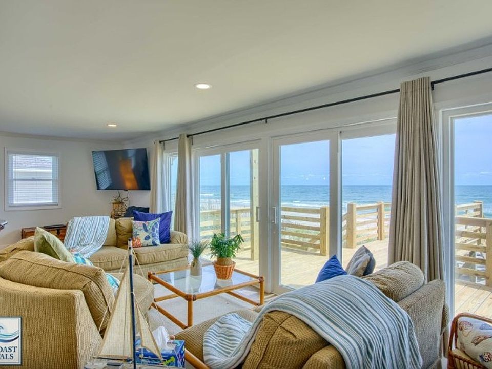 FURNISHED MONTHLY RENTAL - ONE MONTH LEFT NOW THROUGH APRIL 14TH Oceanfront with gorgeous view of the beach throughout! This oceanfront home is in a quiet residential area but only a quick drive or bike ride to all the shops and restaurants that make up Surf City. There are several places in the living room to sit and enjoy the view and each other's company. The dining room has a table seating 8. The well-equipped kitchen has a second table for 4. A large screen mounted TV is perfect to catch a movie or watch your favorite team. There is a full bathroom off the kitchen. The generous deck beckons you to lay out, read a good book, have a refreshing drink or just watch the waves. The stairway from the deck takes you onto the beach. On the first floor you'll find the primary bedroom with a king size bed and large mounted smart TV and ensuite bathroom with bathtub/shower. The second floor has the remaining 6 bedrooms. There are 4 bedrooms with queen size beds, 2 of these are oceanfront with private balconies. Each queen room shares a full bathroom with a bathtub/shower with its neighbor. The 2 bunk bed rooms are perfect for the kids to have their own space. All bedrooms have a mounted smart TVs. 7 bedroom, 4 bathroom Single Family Home located in N. Topsail Beach, Topsail Island. First Floor Dining table seats 8 Kitchen table seats 4 Full Kitchen Living room furnishings: 2 seating groups, mounted smart TV Large deck off living room/ dining room Primary Bedroom: King bed, mounted smart TV, ensuite bathroom with bathtub/shower Full bathroom in hall Second Floor 4 Queen bedrooms, mounted TV in each room 2 Bunkbed rooms, mounted TV in each room (4 twins) 2 shared bathrooms with bathtub/ showers Washer and Dryer located in locked room under home. Topsail Island is a 28-mile-long barrier island made up of marshes, estuaries, dunes, and shoreline. Sandwiched between the Atlantic Ocean and the Intercoastal Waterway, Tops'l as the locals call it is home to several fishing piers including the Seaview Fishing Pier; 875 feet of planks were used to construct this pier which is the longest pier on the North Carolina coast. Privately owned shops, restaurants and attractions abound on Topsail as well as the neighboring mainland towns. Learn the history of Topsail at the Missiles and More Museum and understand how to be a good steward to the sea at the Touch Tank Aquarium in Surf City and the Karen Beasley Sea Turtle Hospital.
