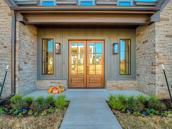 This brand new masterpiece by Bear Creek Homes perfectly blends timeless architecture with rich, modern design. Located in the gated Timberland Creek community, it’s nearing completion and ready to impress with its elevated craftsmanship and thoughtful details throughout. The exterior sets the tone with a mix of materials to create a sophisticated look that is both classic and current. Inside, the open living, kitchen, and dining areas flow seamlessly together, creating a space that feels expansive yet inviting. A vaulted ceiling with wood beams and designer lighting draws attention upward, while large windows bathe the room in natural light. The kitchen is anchored by a custom island with warm wood tones, quartz surfaces, and luxury appliances, complemented by a striking finishes. The interior design strikes the perfect balance between warmth and depth with a perfectly moody mix of textures, colors, and materials. From the layered cabinetry finishes to the contrasting stone and wood details, every element feels intentional and refined. The primary suite is a showpiece all its own. A spa-inspired retreat features dual vanities, a walk-through shower, a freestanding soaking tub framed by a vertical wood accent wall, and elegant designer lighting. The oversized closet connects directly to the laundry room for everyday convenience. Three additional bedrooms and a dedicated study offer flexibility for any lifestyle. Upstairs, over three hundred square feet of unfinished space allows for future expansion — ideal for a bonus room, media area, or storage. Out back, enjoy wooded privacy and a covered patio designed for relaxing evenings or weekend gatherings. Built with intention and quality, this home is sure to make you fall in love. Located in Edmond Schools. Welcome Home!