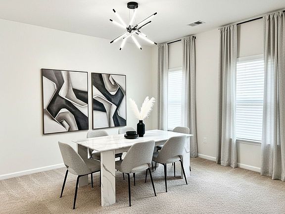 Two-story high ceiling in the living room space flows into the dining area that also overlooks the community pond. Kitchen features double level granite countertop, with room for dining stools. White marble herringbone backsplash. Pendant lightings, closet pantry, and plenty of kitchen cabinets.
