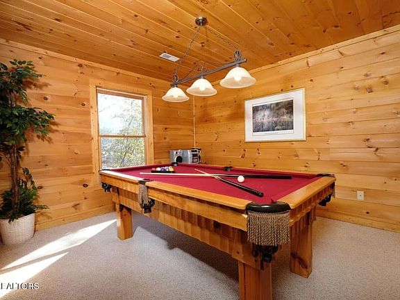 The main-level master suite offers a private escape, featuring a luxurious king bed, flat-screen TV, and a jetted spa tub for the ultimate relaxation experience. Upstairs, the game-room loft sets the stage for endless entertainment, with a custom-carved pool table, stereo system, and cozy lounge space overlooking the great room below. The second bedroom suite features a comfortable queen bed and private bath, while a small sleeping nook upstairs provides extra flexibility for guests.
