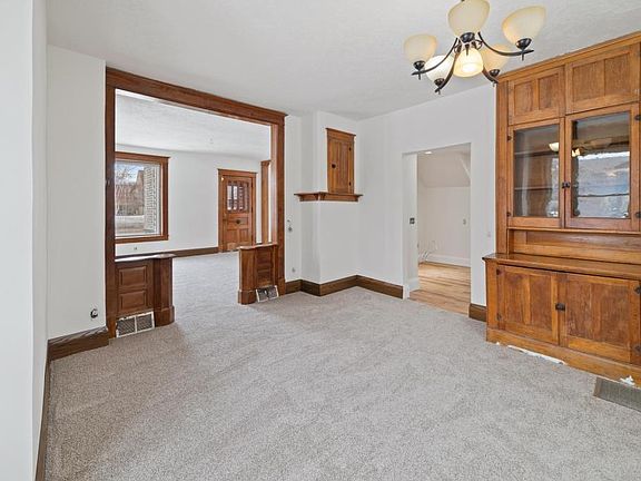 This 100+ year old home sits on the lot where the original "Merchants Hotel" was located back in 1871. Around 1909 the hotel was razed and this large 2-story brick home was constructed. It has undoubtedly undergone several renovations/additions plus many newer windows & recent (partially finished) remodel. Some of the updated finishes include carpet & paint throughout. Build your dream cooking space & complete the main level kitchen to accent the antique finishes throughout the home. The main level is comprised of a formal dining room, living room w/FP, screened front porch, (future) kitchen & a rear breezeway connecting to the huge 30x25 garage w/8' doors and horseshoe driveway. Upstairs are 4 bedrooms plus full bathroom. Finished 3rd floor walk-up attic would make an ideal flex space! The remodeled LL has a family room & in-law suite w/bedroom #5, full bathroom and kitchen. Zoned R2 (Duplex possible)