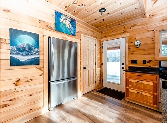 Beautifully constructed by premier local builders, this custom home was built with ease in mind. It is flooded with natural light, and has an inviting open floor plan. This functional kitchen sports a large pantry, stainless appliances, and a bonus built in commercial grade griddle. Upstairs you will find a large open loft/game or gathering room, 3 bedrooms, and 2 full baths. This building was framed to allow for the installation of a standard corner staircase rather than the existing spiral staircase. This contemporary style home sits on 8 private acres of lush open fields and wooded land with access and frontage on the West Branch of the Carrabassett River. Enjoy peaceful views from the large covered porch, or morning coffee and beautiful sunrises from the bedroom balcony. Snowshoe across the open fields in the winter, jump in the sauna and splash in the river in the summertime. With easy access to ATV and snowmobile trails. just a short drive to Sugarloaf and Saddleback make this property perfect for year-round living, vacationing, or even an income producing investment opportunity. Out of sight but only 2+miles from Kingfield Village. For the gardener! Wow! This is an open canvas. The fields are fertilized and harvested through out the year in cooperation with nearby organically certified farm management. This partnership does not run with the property but can be continued if a new owner wishes to do so.