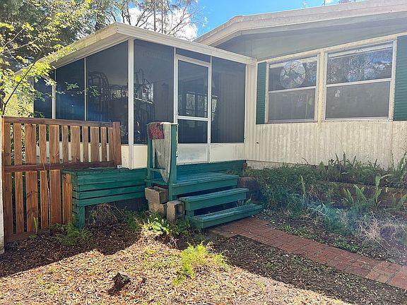 Welcome to your nicely nestled 4.5 acres! Quite the foliage with great pines, magnolias, azaleas, japanese magnolias, dogwood trees, grape trees and blueberries and oranges. This 2/2 mobile has been well kept with 2 yr old refrigerator and dryer, 3 yr old washer, security system, a screened in porch, two living areas, dining area, kitchen with tiled countertop, a saloon style bar, a second screened lanai off the paved courtyard with brick planters. The roof is metal with a roof over, there is also a separate block building/workshop set up for laundry. Many years of care and detail has gone into this quaint piece of land. Take a look!
