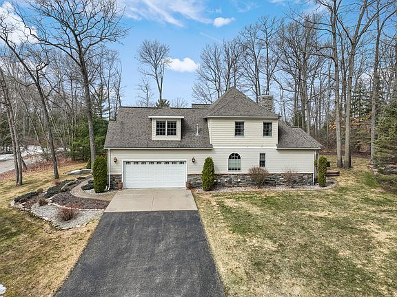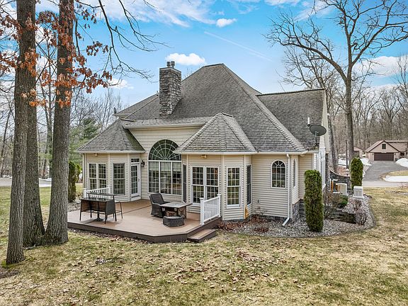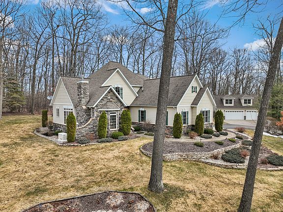 Located in one of Houghton Lake's most prestigious neighborhood's you'll find this exquisite custom built home. This sprawling 3800 sq ft ranch sits on just under 3 acres with your own private oasis of beautifully landscaped grounds including a pond with overflowing waterfalls and an additional 3 car detached garage with a 500 sq ft apartment above. The main floor holds an open concept living/kitchen area with brand new wool carpeting throughout the living spaces, hardwood floors through the dining room and hallway, and tile floors in the kitchen & breakfast nook. The expansive kitchen has an enormous amount of cabinet space for all your kitchen needs, brand new quartz counter tops and newer kitchen appliances including a high end Thermador range and dishwasher. The main level also holds both a living room and family room each with its own gas fireplace. The oversized primary bedroom is made to be your sanctuary. Plenty of room for your bedroom furniture, a quiet reading corner, or desk space, with a doorway to step out back to your porch for an evening cocktail overlooking the beautiful pond and waterfall on those warm summer nights. The primary bath holds even more to desire with a vanity space, private commode closet, large jetted tub, and beautifully tiled shower with multiple shower heads. The walk-in closet is a massive size with plenty of room for both his and hers closet space.