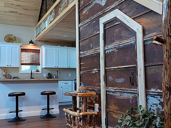 Cambria quartz countertopsCustom pine doorsReclaimed steel accentsBlue stain pineBamboo window treatments