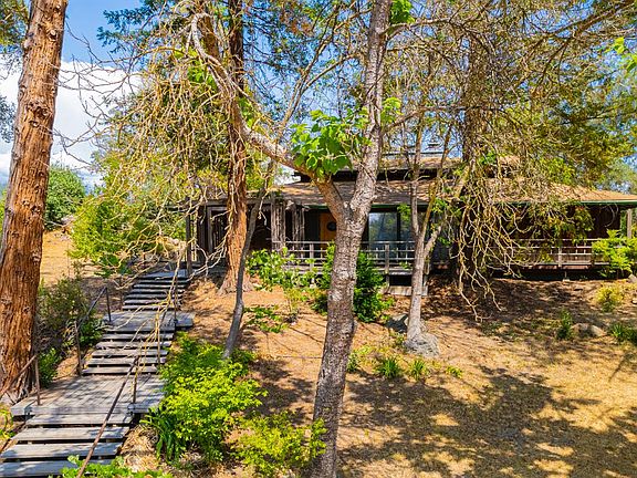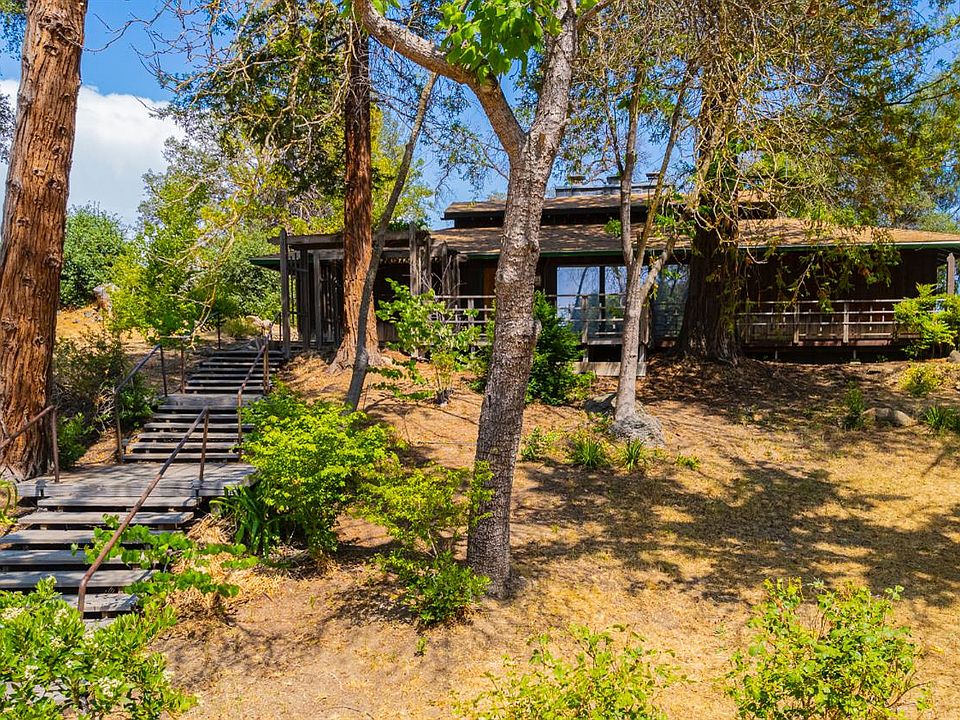A Timeless Masterpiece Inspired by Nature and Design: Step into a truly one-of-a-kind home, lovingly designed and handcrafted by the original owners with inspiration drawn from the iconic works of Frank Lloyd Wright. This architectural gem beautifully blends natural materials, thoughtful design, and timeless craftsmanship to create a warm and welcoming living experience. The heart of the home is anchored by a striking black slate fireplace, not only a statement feature but a functional divider that eliminates the need for hallways, creating a flowing open-concept layout. Above, the pagoda-style roof and clerestory windows bring in gentle natural light while honoring Asian influences. Massive decorative chains serve as both structural support and striking visual elements, embodying the philosophy that form follows function. Inside, you'll find a rich variety of authentic wood finishesfrom Bruce oak flooring to cherry, ash, walnut, English elm, and clear redwood panelingeach thoughtfully selected and sourced from Georgia Pacific. Acoustic ceiling tiles throughout enhance both the peaceful ambiance and the entertaining potential of the home. Designed in the late 1960s, this home features an ingenious passive cooling system, eliminating the need for air conditioning. Car enthusiasts and hobbyists will love the expansive four-car garage.