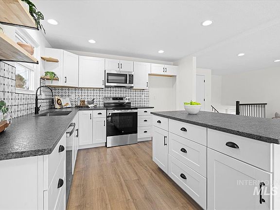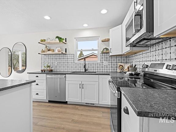 Don't miss this stunning split level in West Boise that has been beautifully rejuvenated! This home features 5 bedrooms, 2 bathrooms and 1972 square feet--all of which has been modernized! A gorgeous open concept kitchen that showcases sleek, modern black granite countertops with bold backsplash against white cabinets and matte black hardware. The contrast with the neutral floating shelves & LVP floors will definitely turn some heads. Brand new appliances ready for you to enjoy! Throughout the home you'll notice brand new LVP and carpet, new paint, new trim and new light fixtures. Everything in this home was touched! Main level features master bed, & an additional guest room. Downstairs has three additional bedrooms, a bathroom, the laundry room and a secondary great room! Both bathrooms feature tile showers, new vanities and counter tops. Brand new deck off the kitchen to enjoy those summer nights and BBQs! NO HOA! Approx 10 X 33 RV parking on North side of property! Open House Saturday 1-3