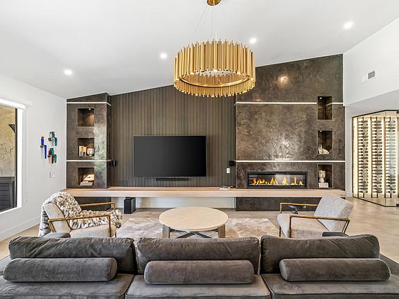 Discover your Shangri-la in this truly turnkey move-in home with private courtyard pool. Yes, every item from furniture to electronics to golf cart to wine room contents to cookware isINCLUDED. Seller retains only select original artwork. This total home renovation (2024) is offered complete with all furnishings thoughtfully curated and purchased new to mesh seamlessly with the easy living desert motif. Enter the double entry doors and you'll say a definite 'WOW' to the fresh kitchen and quartzite counter tops with 'waterfalls' on each side. Stainless steel appliances include professional grade double refrigerator/freezer combos, six-burner gas range with two ovens and overhead exhaust hood, dishwasher, microwave and built-in commercial ice maker. The sleek custom Bianco Gloss cabinetry package elevates the entire kitchen to a level seldom seen in this price range. Interno Dune large format Italian porcelain tile flooring throughout the entire home transitions to the expansive outdoor patio featuring triple fairway golf and mountain views.The primary bedroom suite is reminiscent of resort style living with massive zero entry dual shower, floor-to-ceiling 48'' x 48'' wall tile complimented with Dolomite Italian floor tile. The second and third bedrooms open to the courtyard pool offering privacy in distinctly separateareas of the home. If you need more evidence this home is a 'can't miss' step into the generous flex room with extra storage that's perfect for a second bedroom junior suite or office.
