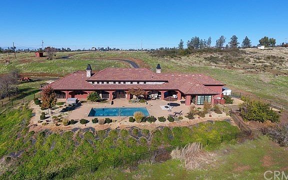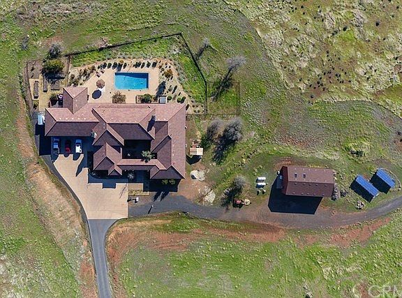 ABSOLUTELY AMAZING HIGH END CUSTOM HOME! The details and craftsmanship are over-the-top! You will feel as if you just stepped into an INCREDIBLE European Villa! The open 5718 Sq. Ft. floor plan begins with an inviting 18 ft. high decorative cross beam ceiling, stained and polished concrete floors throughout, a huge galley style kitchen with stained and polished concrete counters, which seats 9-10 bar guest, a walk-in pantry and butler center. The home features 5 bedrooms, most with its own bathroom, 6 bathrooms, larger 5th also bedroom serves as a media room, separate office, 2 Living rooms with a natural stone fireplace and 2 large dining areas. Bonus features include a 400 Sq. Ft. separate guest quarters with kitchenette, covered outdoor cook center, beautiful in-ground pool, an 1560 Sq. Ft. shop with roll up doors for RV and boat parking, 1155 Sq. Ft. garage and owned solar panels. This highly usable18 acre property has lots of potential to create additional venues or expand on your needs. The views are incredible! The gentle rolling hillside will make a beautiful backdrop for a Wedding Venue, Retreat, Bed & Breakfast, Conference Center, horse property and more! PLUS all furniture and the tractor go with the sale of the home! Making this home move-in ready! Too many details to list but the photos are worth a thousand words!