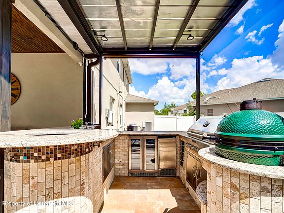 Completely remodeled and tastefully decorated, this stunning home is located on a cul-de-sac in the gated community of Sterling Hill! You will not find cheap builder-grade finishes in this beautiful home. Updates include: remodeled kitchen and bathrooms, tile plank flooring, plantation shutters throughout, crown molding, decorative garage doors, decorator lighting, built-in bookcases, added fireplace, interior paint, added ship-lap on walls, custom shelving in bedroom closets, pool pump and salt chlorination system, and a cozy built-in pet house under the stairs! There is one guest bedroom and full bath downstairs and 5 bedrooms, 2 bathrooms, and a laundry room upstairs for added convenience. The property includes an Incredible salt-chlorinated pool with spa, waterfall, and swim-up table, along with a travertine pavered lanai featuring an Impressive outdoor kitchen/bar equipped with beverage cooler, built-in fire pit, built-in kamado ceramic grill, and gas grill. It is truly turn-key ready! Sterling Hill offers 2 clubhouses, 2 pools, a fitness center, playground, splash pad, tennis and basketball courts, and boat/RV storage, all with a low HOA fee. One of the top-rated schools in the county is nearby, and the property is conveniently located near shopping, restaurants, medical facilities, and the Suncoast Parkway for a quick commute to Tampa. Don't miss the chance to make this exceptional home yours—schedule a showing today!