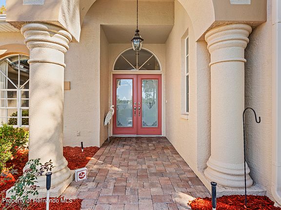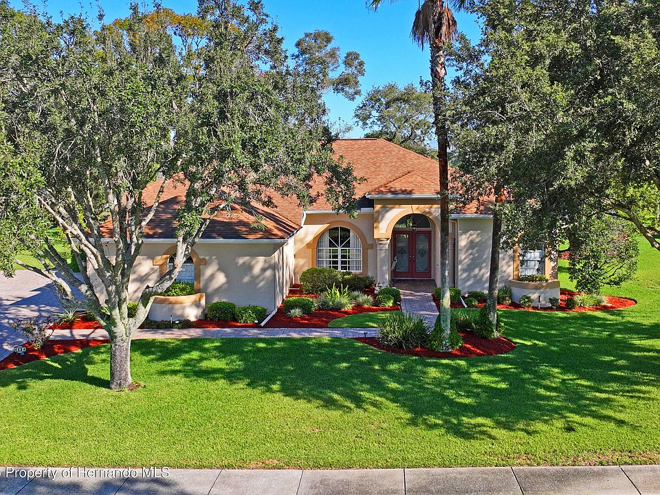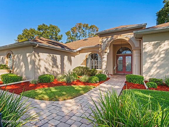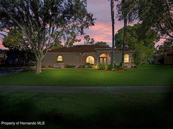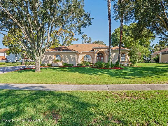 This beautifully maintained one-owner home near the 5th hole offers 2,468 sq. ft. of comfortable living space with 4 bedrooms, 3 baths, and a 3 car garage. Built in 1997 and lovingly cared for by the original owners, this home features an open floor plan with high ceilings, a spacious kitchen with granite countertops, and plenty of cabinet space. Enjoy the large Florida room overlooking the peaceful pond, golf course, and mature trees- perfect for relaxing or entertaining. The outdoor patio showcases brick, flagstone, and terrazzo stone, surrounded by freshly mulched landscaping newly painted exterior home for great curb appeal. Additional highlights include a paver driveway and walkway, Water Heater 2020, roof replaced in 2015, AC installed in 2008. This home is located in a quiet, established gated neighborhood close to shopping, dining, and all conveniences. Appliances and extras included: refrigerator, stove, microwave oven, dishwasher, washer, dryer, master bedroom TV, Hot Tub, 2 patio sets with one umbrella, weber grill, 2 ferns and a swing. Close to the Suncoast Parkway 589 and Tampa Airport. Bike path is right out the back gate. Come see the well loved home and experience the serene views and inviting lifestyle it offers!