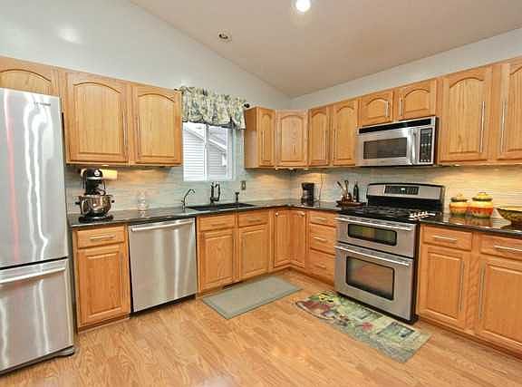 This unique walkout ranch is nestled in the heart of a very quiet neighborhood, and backs to trees and bike trail. The 12' vaulted ceilings / "great room", gives this home a lot of natural light and very warm feeling. This home has granite, new carpet throughout, stainless steel appliances, large deck with patio below, large landscaped yard. Huge master suite has handicapped accessible shower. His and hers closest, and 1st floor laundry. Come make this house your home.