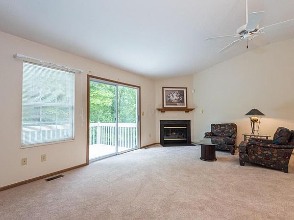 Spacious condo with open living space, vaulted ceilings and cozy gas fireplace. Main level en suite with huge walk in closet! Lower level has its own en suite and walk in closet. Enjoy wooded scenery from decks. Lower level is a walk out with deck and beautiful view. New laminate and carpet flooring. Easy access to I270.