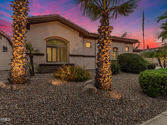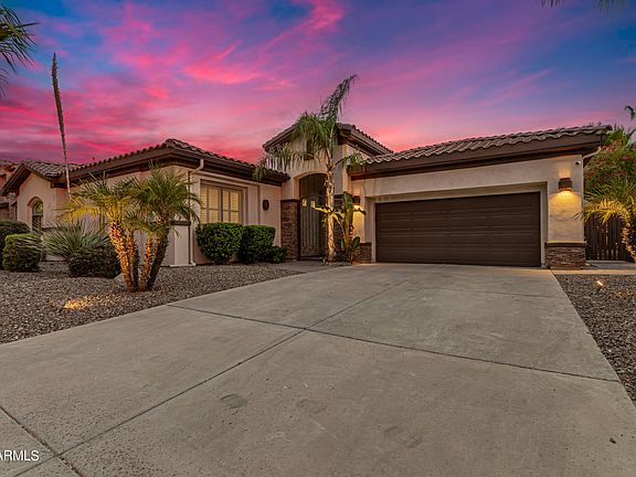 Stunning 4 bedroom, 4.5 bath Toll Brothers home. South wing features a gourmet kitchen with updates completed in 2021 high end cabinetry, quartzite countertops, stainless steel dual ovens & appliances, walk-in pantry, huge island & breakfast bar all opening to formal dining room, large kitchen dining area and family room with a gorgeous stone gas fireplace. Private spacious main en suite with large dual walk-in closets and a luxurious bath and private access to resort style backyard. A true split floor plan North wing hosting 3 large bedrooms, 1 with full bath, an office with full bath & 2 additional beds with adjoining bath, PLUS a large bonus living/ entertaining room. Elegant designer touches throughout including plantation shutters and a designer front door. Incredibly designed Resort style yard complete with sparkling custom pool/ water feature, huge extended covered patio, pergola / built in island grill, and professional misting system. A MUST SEE! New items include AC in 2018, new ceiling fans in 2020, dual zone wine cooler in the built in bar area in 2021, surround sound system indoor and outdoor and gutters installed.