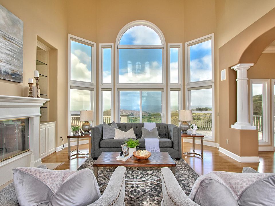 Nearly 5 acres exclusive Mediterranean Beauty behind the gates of Renaissance Estates and almost 5500 sq.ft. of elegance and unsurpassed quality, offering commanding views of the valleys of DeLuz, the Pacific Ocean, and the city lights. As you enter, you are greeted with a grand high ceiling living room accompanied by a beautiful stone fireplace. The kitchen dazzles with lit glass-front cabinets that bring elegance and class for displaying your decorative and cherished keepsakes. This gourmet kitchen features stone countertops with dual islands, stainless steel appliances, dual dishwashers and sinks, and a walk-in pantry, making it a highly functional space. Features include Viking appliances, a Morning room overlooking the mountains, and a butler pantry leading to the formal dining room. Main Floor Primary bedroom boasts a retreat, fireplace and sitting area, balcony over the pool and spa with its own stairwell, and an opulent bathroom with a dressing area and fantastic views as well! Additionally, the main floor office/library and downstairs recreation room and maids quarters lead to the large outdoor living area complete with pool, spa with cascading waterfall, BBQ Bar and Kitchen, fire pit, fruit trees, and spectacular views! Owner pays the Association dues and for gardening and pool services. Renter pays for utilities and renter's insurance. The house is in a wildfire hazard zone and wildlife, such as coyotes, hawks, and swallows are nearby. Swallows are a protected species and their nests must be removed before they take up residence. The owner's representative is a licensed real estate agent. Shown by appointment only, and listing agent must accompany all showings, per HOA rules. Need 24 hr notice minimum, and POF prior to showing.