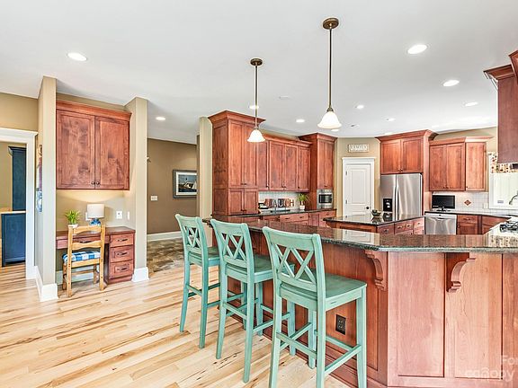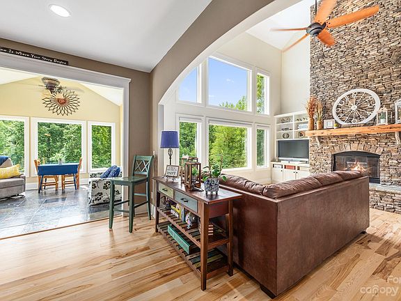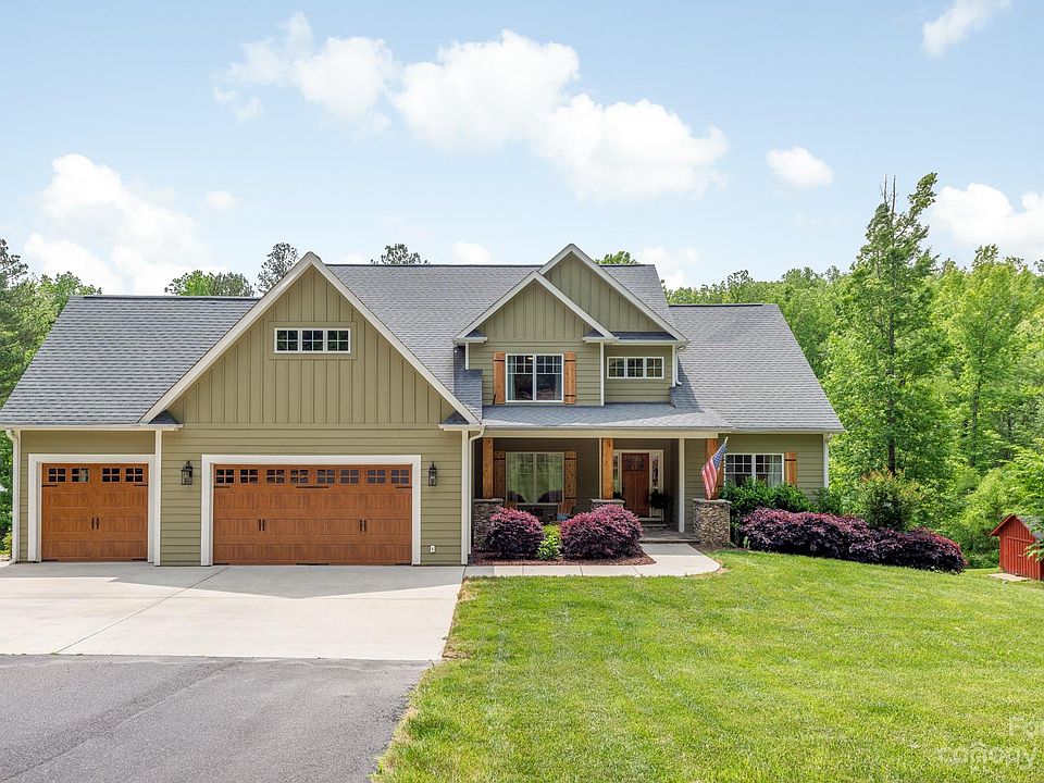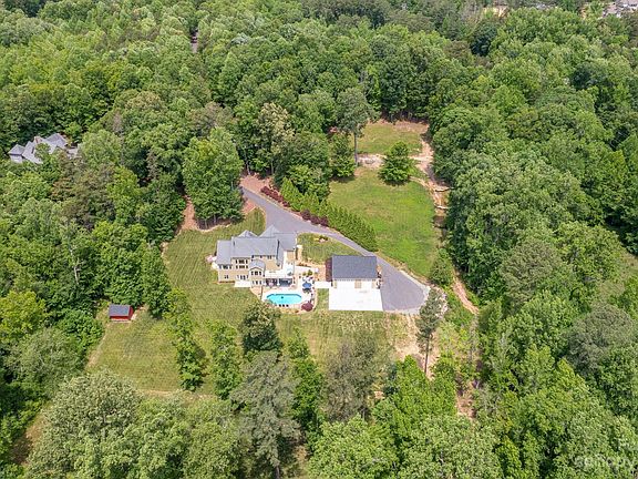 This Craftsman style home offers the perfect blend of style and tranquility. Situated on 11 private acres within a gated community, it guarantees peace and security. The refinished hardwood floors exude elegance, while the stunning pool and panoramic views create a serene outdoor oasis. With the primary bedroom conveniently located on the main level, accessibility is prioritized. Ample parking is available with 5 garage spaces, accommodating vehicles and storage needs. The gated community not only adds an extra layer of privacy but also ensures a sense of exclusivity. This three level home with a walkout basement is flooded with abundant natural light, creating a warm and inviting ambiance that complements the overall aesthetic. This home is only 29 miles to Charlotte International Airport and 30 miles to uptown Charlotte.