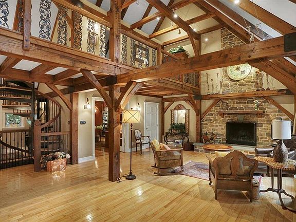 No expense or thought was spared on the finishes and features in this captivating timber frame retreat. A two story foyer leads to the greatroom with soaring ceilings, stone fireplace and beautiful blonde hardwood floors that extend throughout the home. French doors open to the deck where you can enjoy the woodland magic and, in winter, the panoramic views. The kitchen has a six burner Wolf range, hand crafted cabinetry, honed bluestone counters, tile backsplash and breakfast area. The dining room has ample room for gatherings of family and friends A library/study makes a perfect home office or possible fifth bedroom. A powder room, walk in pantry and huge coat closet complete the main floor. Upstairs, the balcony overlooks the great room. (the top section of the railing is removable). The master suite boasts a large bathroom with claw foot tub and stall shower. The hall bath has a raised tiled jetted tub/shower and can be accessed directly from one of the two secondary bedrooms. Every room has unique architectural details that showcase the beautiful pegged Post and Beam construction. The wonderful lodge feel of the walkout basement is another breath-grabber. A soapstone bar area with dishwasher and fridge, a live edge bar with rustic pine log stools, a brick hearth with propane stove are just some of the features of the game/family room. The fourth bedroom, third full bath and huge laundry/utility space complete the lower level. So much to say so little room!
