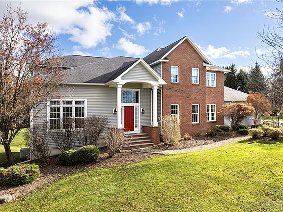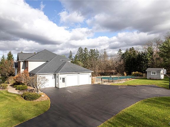 Gorgeous transitional home situated on a sprawling 2.4 acre secluded lot located in the coveted Spruce Ridge neighborhood. This exceptional 5 bed, 3.1 bath property totaling 5,277 sf, located on a peaceful cul-de-sac offers luxury living & ultimate privacy while still being conveniently located. A grand 2-story foyer welcomes you to an open floorplan offering elegant living spaces with gleaming hardwood floors & tranquil views. A chef's kitchen showcases Brookhaven custom cabinetry, large island with breakfast bar, Sub-Zero refrigerator, built-in beverage and china cabinet, & a huge walk-in pantry. The bright airy open floorplan is great for entertaining. The home office with built-in shelves & cabinetry offers a private and organized space. A composite deck & an L-shaped heated saltwater pool, makes this home an entertainer's dream. Upstairs are 4 spacious bedrooms & 2 bathrooms. An elegant primary suite has an impressive walk-in California Closet. The finished W-O basement offers a huge 5th bedroom & 3rd full bath along with a large rec room & more storage! F-M Schools with Pompey taxes! Amazing opportunity to own this exquisite home on one of the best lots in the neighborhood!