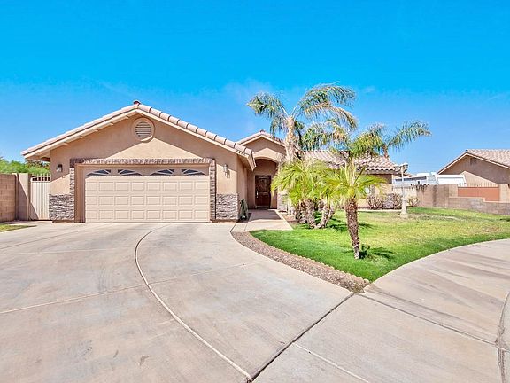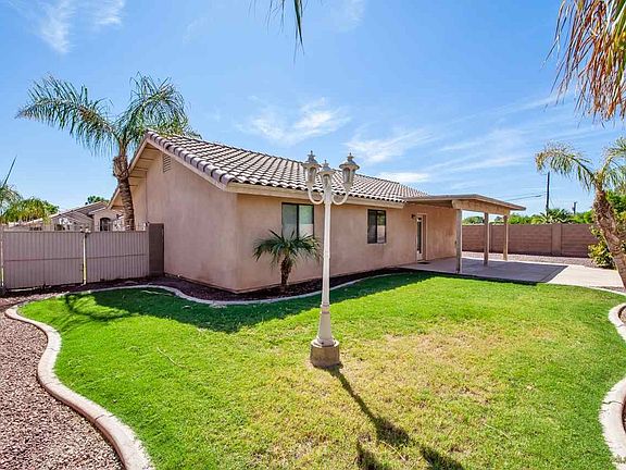 Well maintained home nestled in cul de sac. Double metal side gates and metal walk gate for access to back yard. Trees and grass are on times sprinkler and drip system. Brick veneer deco and tile roof. Large back covered patio. Portico entry to open floor plan with large breakfast bar and French door to block wall fenced back yard. Tile flooring in kitchen, dining, entry and bathrooms. Beautiful use of square footage. Garage door opener and side door that leads to yard.