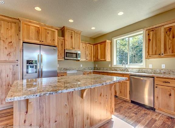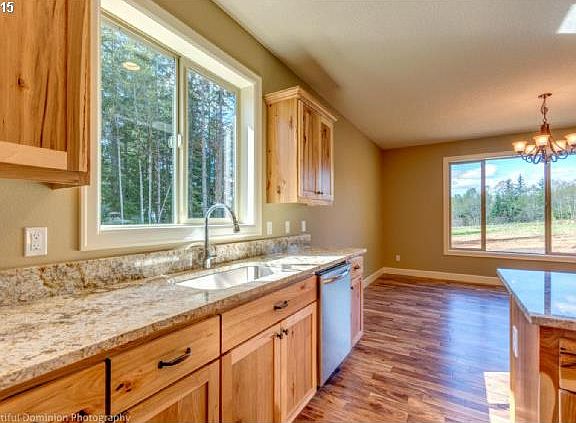 New custom ranch 2542 sf 4 bdrm + bonus rm, 2 bath on 2.98 useable,light filled acres w/room for shop. High end finishes; Cultured Stone, quality millwork, slab granite, rustic hickory cabinetry, Acacia 3/4 solid hardwoods, master suite with custom tiled shower, central vac ready, stainless appliances. Covered patio. Builder is Edison Homes. Broker related to Seller. This is a really nice piece of land.