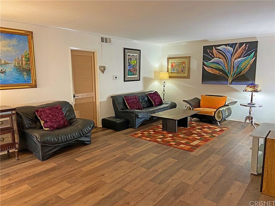 Motivated Seller! Peaceful and Quiet Location in the Most Desirable area of Sherman Oaks! Very large (1200+sq ft) 1 Bedroom condo with wide open floor plan! Large living/family room and separate dining area. Large bedroom with separate vanity area and lots of closet space. 2 separate sliding glass doors lead to a patio which faces a lovely small garden area and courtyard. Secured building with locked entrance, pool, jacuzzi, bbq area, recreation room and new laundry machines and driers throughout building. 1 car covered parking space with 2 built in large storage cabinets.This is a first floor unit facing inward to the community courtyard, not toward the street at all. Newer wood floors in living room and brand new carpet in bedroom. Walking distance to Ventura Blvd and all the restaurants and shops. Walking distance to Ralph's beautiful new mega store as well as a 7/11 convenience store. Easy freeway access (405 and 101) and close drive to Target, Costco, Best Buy, Universal Studios and Gelsons. Walking distance to public transit (bus). Walking distance to LA River trail with peaceful quiet shady walking and exercise space.
