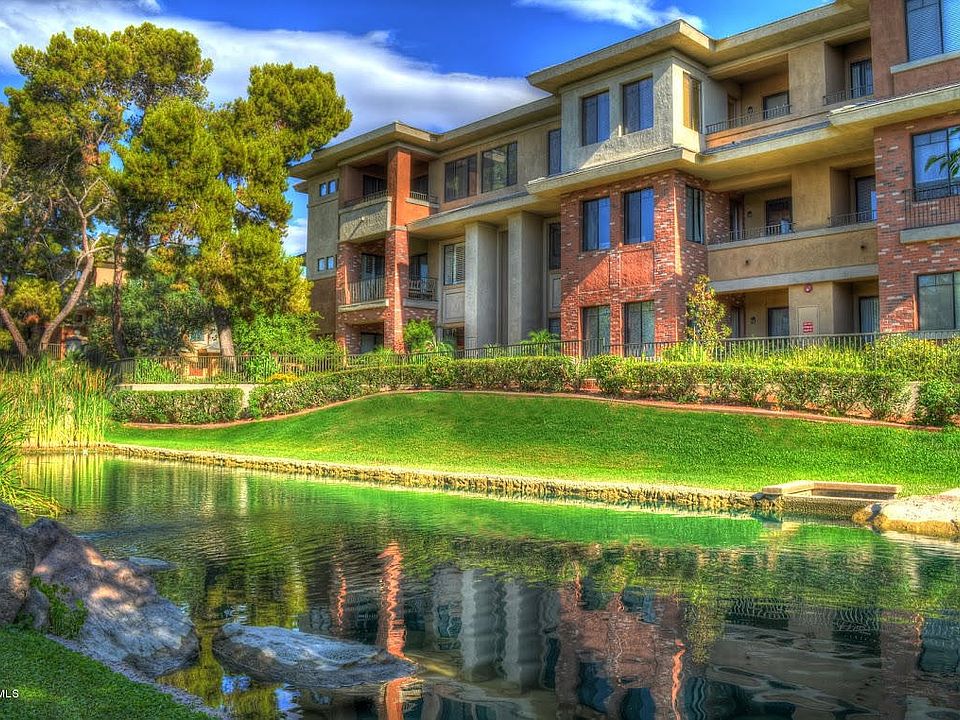 INSTANT EQUITY. 32K OVERALL REDUCTION. The ONLY waterfront, ground floor, 1 Bed, end unit, in beautiful sought after Arcadia Grove! Absolute immaculate luxury! New in 2014- Upgraded carpet, paint, travertine medallion in foyer and on private patio, granite vanity and vessel sinks in bath. Unit overlooks a large pond and waterfall. Master Bedroom contains an office/sitting area. Garage #132 is attached to the building making it an easy indoor walk to your new home. Front door opens to beautifully decorated, temperature controlled hallways paid for by the HOA. Community offers heated pool, spa, fitness center and clubhouse. This unit rents every year for $2500/month furnished during high season.