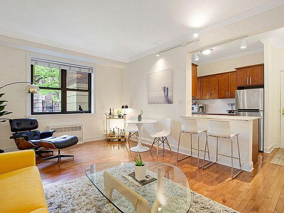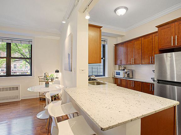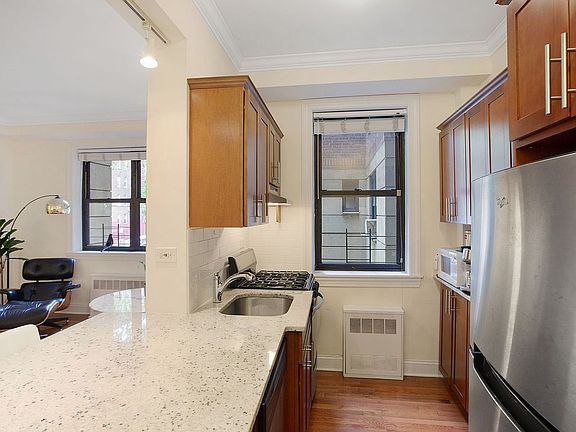 Enjoy the comfort of your one-bedroom home with a sylvan courtyard view and bright Eastern Exposure. This recently renovated apartment has high ceilings, newer hardwood floors and a cute kitchen with cherrywood cabinets, granite counters, and stainless-steel appliances including dishwasher. Great flow. Great vibes.