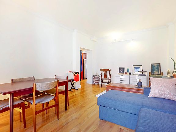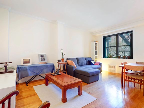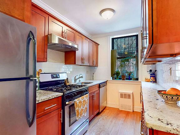 Enjoy a functional layout and lots of space in this updated one-bedroom apartment in the lovely neighborhood of Hudson Heights. Glorious hardwood floors run throughout the entire residence, including the kitchen. The location is also a huge plus, right on Broadway and just moments from Fort Tryon Park. Entering the foyer, the updated galley kitchen is on your left with granite counters, white tile backsplash, and stainless steel Whirlpool and Frigidaire appliances. Cherry wood tone cabinets and a nice big window add to the warm and welcoming feel. An expansive main living room is to the right, with wall-mounted rack lighting and a fire escape right outside a large window overlooking the courtyard. A central hallway with lots of closet/pantry space leads from the kitchen area to private quarters. The large bedroom has sunny wraparound corner windows with deep sills, perfect for your potted plants. There are two closets plus an additional standing wardrobe. The bath has wall-to-wall tiling, a window over the combo shower/tub, a cute pedestal sink, and a retro-style twin lamp fixture over the modern mirrored medicine cabinet. Fort Tryon Gardens is a pet-friendly cooperative complex with beautifully tended flower gardens, a live-in super, laundry facilities in each building, elevators, steel storage units, and bike storage. This building is at the corner of W. 192nd and Broadway, with bakeries, groceries, bars and restaurants just steps away. One block to Fort Tryon Park, the Met Cloisters, the Hudson River, Broadway Performing Arts Center, Legacy Bar & Grill, Locksmith Bar, the 190 St A train, and so much more. You'll be right in the heart of Uptown!