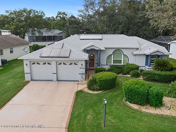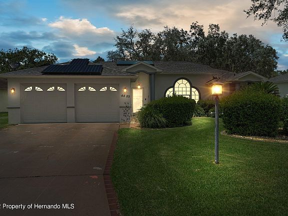 Active with Contract - Do not miss the lovely Pool home located in the desirable Regency Oaks Community. This 3 bedroom, 2 bath, 2 car garage, split floor plan, features whole house Solar Power that will give you tremendous savings on your electric bill. The Solar powered water heater has an electric back-up system and the full attic fan is Solar powered also. The focal point in the Living room is a beautiful Custom Window which is Hurricane Proof Impact Glass, with custom Plantation Shutters. Living room and Dining room have Cathedral ceilings, and fans throughout. There is a full house water softener, newer carpeting in the Living room and Family room, newer laminate flooring in the Breakfast Nook and Kitchen, and recently painted interior and exterior. The extra large Lanai and pool area has plenty of space and a great place for entertaining and enjoying our beautiful weather. The pool was resurfaced with Diamond Bright in 2018, the pool deck was also resurfaced at the same time in 2018, and a new pool heater was installed in 2021. The Laundry room and Breakfast Nook both have solar tubes creating a light bright area. The Laundry room also has cabinets for storage and a laundry tub. The spacious kitchen has newer appliances, and plenty of counter space and cabinets. The Family room and Master Bedroom both have sliders going out to the pool area and the Dining room has French Doors going out to the pool also. There is also a well for irrigation. Roof – June 2021, A/C – 2016, Solar Panels – 2018 & 2019. Regency Oaks is a Deed Restricted community with a Civic Association with optional annual membership of $125, which included a community pool, tennis courts, basket ball court and scheduled activities. Regency Oaks is conveniently located near all shopping, restaurants, Home Depot, Lowe's and Weeki Wachee Water Springs. Garage refrigerator does NOT convey.
