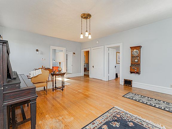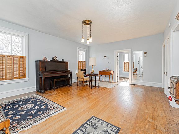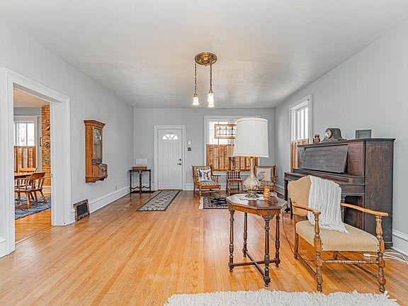 An absolute class act is this captivating 3-5 bedroom, 2 full bath conveniently situated two story aluminum sided home that has been smartly priced at $100,000! So well loved over the years, this gem is virtually totally turn key and ready for occupancy. Main floor of home boasts a bright and airy living room with gleaming hardwood flooring, a classic vintage overhead light fixture, and an adjacent 9X11 den with built-ins, gracious formal dining room with neat exposed brick, comfortably sized family room, equipped eat-in kitchen with an adjacent pantry, large updated full hall bath with an adjacent laundry room area, and a great 6X13 enclosed back porch/mudroom. Upstairs, you will find three large bright bedrooms -- all with hardwood flooring and great floor space (rear bedroom features a sunken 9X14 sitting room) -- and a full hall bath with a newer vanity. Property also features a partial basement, architectural roof (new metal roof over kitchen area), various original interior light fixtures, amazing front mail drop slot, updated Goodman furnace and central air conditioning unit, rear brick patio, 14X10 workshop with concrete floors, electricity, and an excellent attached covered patio area with a porch swing, rear storage shed, rear off-street gravel parking, and all appliances to remain including washer and dryer. Walk to public schools in addition to the historic downtown district from this 1841 beauty! Such impeccable class and character -- truly a happy and warm home!