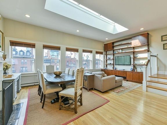 This amazing penthouse has a wall of windows and an architectural skylight which floods the living space with natural light. A cherry & granite kitchen blends beautifully with the character of the space which is open to the living room and dining areas. The fireplace mantle and custom built-in shelving strikes a perfect balance of upscale and comfort, ideal for comfortable evenings at home or entertaining. The convenient internal staircase lends an additional feeling of spaciousness and leads to a newly rebuilt very private roof deck, great for enjoying the fireworks and lovey Boston evenings! Two bedrooms and two full baths include a master with a renovated full bath, laundry and walk-in closet. The second / guest bath has also been recently renovated. Of course, A/Cis a must and it also has been updated. Truly all the conveniences of urban living with the graciousness of Back Bay style.