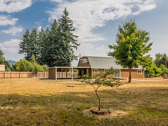 Distinctive barn-shaped home on .57 acres in Falls City, Oregon. 4BR, 2.5BA with cherry wood floors, stainless steel appliances, and wood-burning stove. Built-ins, spiral staircase, gated entry, loop-around driveway. Convertible 5th BR. Fully fenced yard with irrigation. Embrace comfort, character, and outdoor living. Experience Falls City's charm amid Willamette Valley beauty. Don't miss this!