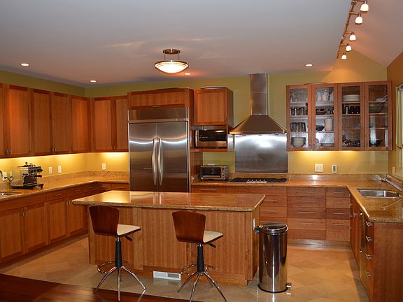Golden Gate Bridge and SF Bay view. Modern kitchen with high end appliances, heated floor, ample cabinet capacity, built in large refrigerator, granite countertops, large island and ample storage in drawers. Hardwood cherry wood flooring thru out. Open floor plan great for entertaining. Light and spacious dining and living room areas. Large master bedroom suite includes large walk in closet room with additional ample storage rooms. Bay view from master bedroom. Master bath includes jet tub and large shower and has heated floor. Designer fans in living room and master bedroom. Two gas fire heaters in living room and master bedroom. Lower level suite includes full bath, bed room, den, second kitchen and laundry hook ups which could be in-law. Hot tub on lower deck. Garage access from alley way. Easy access to Marin & East Bay. 3 decks, including large deck over garage with bay views. Built in music system. Solar panels on roof. Front garden landscaping. House built by original owner for his family and is superbly constructed.
