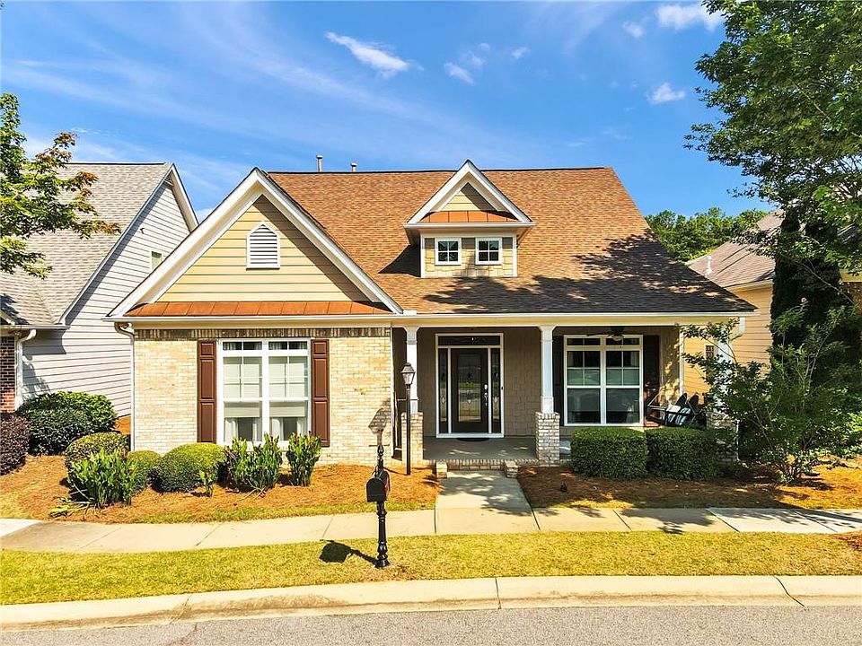 This delightful home, with a highly sought-after floor plan, offers both the Owner's Suite and a secondary bedroom, with full bath, on the main level. The open floor plan exudes elegance and comfort. Custom fiberglass front door and sidelights add curb appeal. The charming front porch with a light blue ceiling and easy-care swing is perfect for relaxation. The back porch, with EZE Breeze tinted windows, screens, and a new cabana door, offers a private retreat - you can see out, but they can't see in! Inside, enjoy numerous upgrades and updates, including Pottery Barn wall sconces, Ballard light fixtures, Kohler Continuous Clean Comfort Height toilets, a KitchenAid 3-rack dishwasher, programmable thermostats, a quiet disposal, and Moen faucets, plus much more. With new HVAC systems in 2021 and 2023, you'll enjoy year-round comfort and efficiency. Top-Down/Bottom-Up light filtering shades provide perfect light control and privacy. The Owner's Suite bath features a custom closet with a linen cabinet, pull-out laundry hampers, a valet bar, and a belt rack, plus upgraded tile and a frameless shower door. Upstairs, a huge bonus/media room, an additional bedroom, and a full bath offer extra living space. Or potential 4th bedroom. Plus, you'll appreciate the easy access to attic storage and the custom design shelving, providing ample space for all your belongings. Location is everything! Drive to nearby restaurants and shopping without a single red light. The HOA takes care of lawn maintenance. Enjoy private access to the Brushy Creek Greenway, which connects directly to the dynamic new Suwanee Town Center on Main Park, opening this summer AND popular Suwanee Town Center, the library and Playtown Suwanee. Award winning N Gwinnett schools!