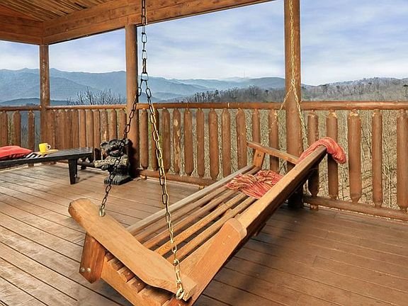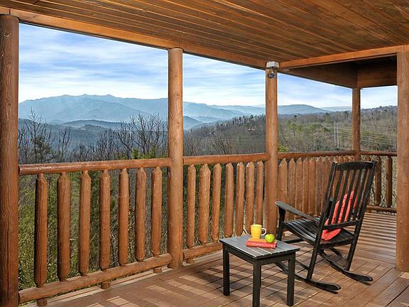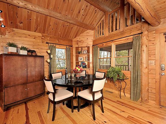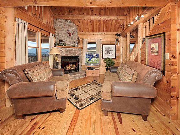 Gorgeous 3 bedroom vacation cabin with a loft nestled in the woods 1 mile off the spur between Pigeon Forge and Gatlinburg, with no steep roads. Features two level wrap-around porches with views of the mountains, stacked stone fireplace in the living room, and jacuzzi tub in master bedroom. Upstairs are 2 loft areas connected by a catwalk. One loft area contains a pool table, and the other is a sitting area with views of the Smokies. 2 more bedrooms and a second living space can be found in the downstairs area, with a private hot tub on the downstairs deck.
