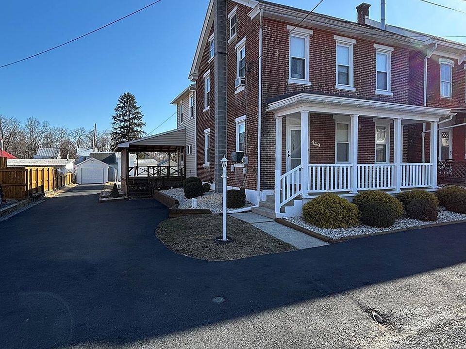 Welcome to 449 Main Street nestled in the heart of Virginville Berks County. Well maintained 3 bedroom 1.5 bath brick home. Home is in good condition but needs some updating. Oak kitchen cabinets, half bath on first floor, high efficiency Weil-McLain boiler, water softener with UV light, and all new replacement windows. Whole house generator (Generac) newly installed to ensure you are never out of electricity. Attic is finished but does not have heat or a/c. Entire deck has a roof and is over 430 square feet in size. Paved driveway leads to a one car garage. Out building/shed has two more garage doors for additional cars and storage. In the shed is an old walk-in cooler. Many years ago this property was owned by the town butcher . All this on a 1/4 acre lot, with a large yard.