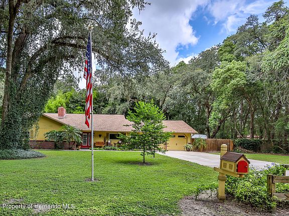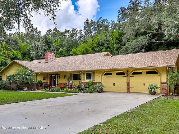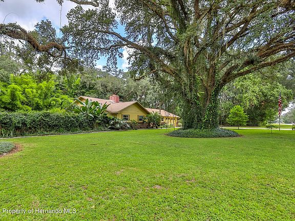 If you want warm and homey, not cold and sterile, this is a must see. If you want to have chickens but have quick access to Brooksville and Tampa, you must visit this home. Majestic Oaks welcome you home after a long day at work. You will be delighted when you walk in and view this amazing remodeled home. From new flooring through out, to the kitchen, to the bathrooms and windows. The kitchen has so much storage, granite counter-tops, soft close drawers, a coffee bar, built in pet feeding station and a gas range with an electric oven that is open to the living room and wood- burning fireplace. The vaulted ceilings add to the openness of the living room & kitchen. Next, step down into the family room which features Knotty Pine ceilings, Cedar wall planks and a beautiful wet bar. The pool table can stay with the house if you want! Off the family room is a bonus room/fourth bedroom with a huge walk in closet. Once outside you are met with a beautiful covered, brick patio with room for your grill, lounge chairs, table and seating for all! The brick continues to surround the open freeform pool which features a color changing pool light to match the mood. Tucked away on the side of the house is a private outdoor shower. You don't even have to run in for a drink of water with the little, plumbed water fountain! With almost an acre of land, the firepit, the chicken coop (with chickens) are well spaced with plenty of room all around. You'll feel like you are on vacation with all the lush landscaping making the backyard feel like your own private oasis.