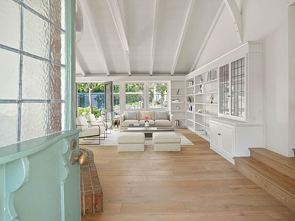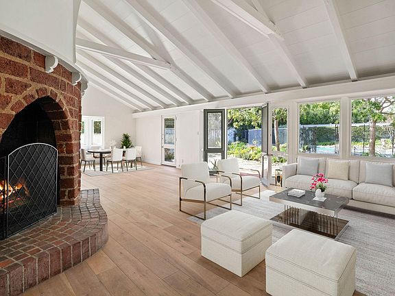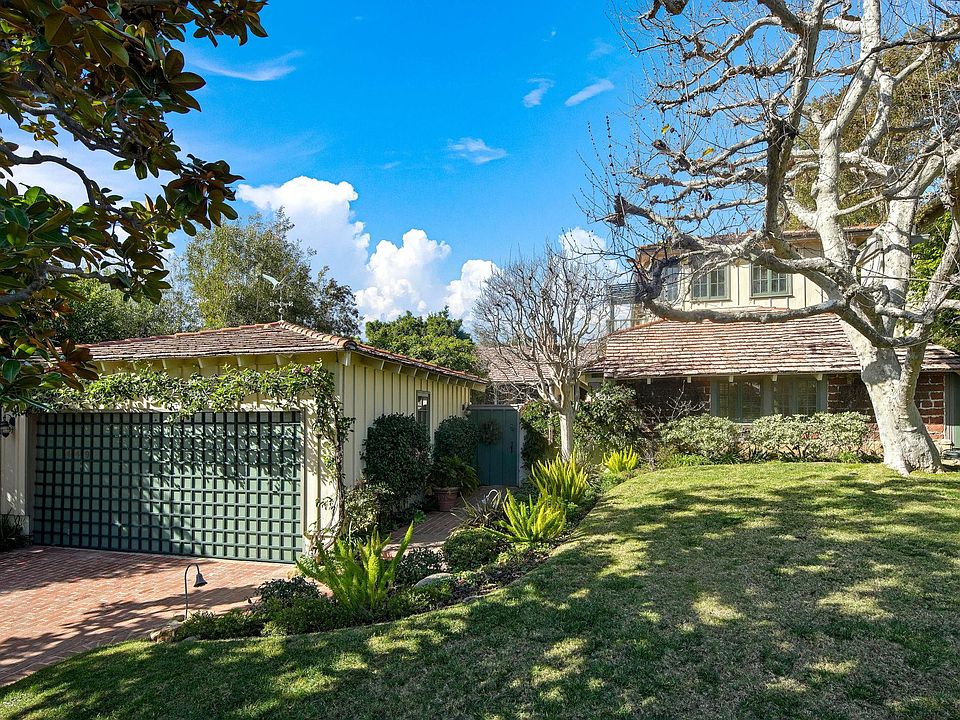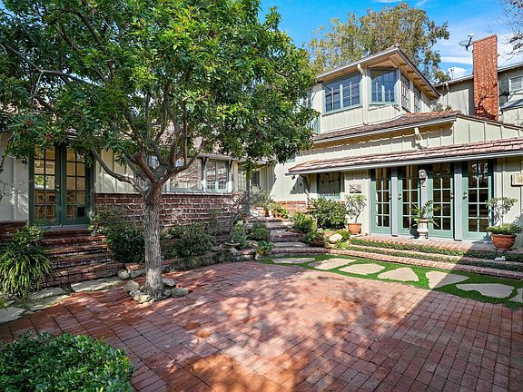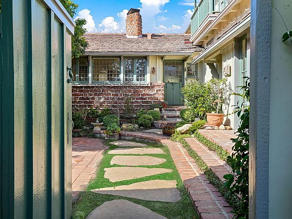 Welcome to this charming, updated traditional home located in the hills of Brentwood, north of Sunset Boulevard. This enchanting home is set back from the street with a large grassy area and mature Sycamore tree in front and invites you in through a gated and private courtyard with a soothing, bubbling fountain. As you walk through the front door, the large rounded brick fireplace immediately draws you into the living room while you enjoy views of the lush backyard with a sparkling pool. The living room includes built-in bookshelves and flows seamlessly to the dining room, featuring a cozy window seat. Both rooms have high vaulted ceilings and are flooded with natural sunlight in the afternoon. The recently updated kitchen features a stainless steel refrigerator and dishwasher, side-by-side ovens, subway tile herringbone backsplash, a double farm sink overlooking the courtyard, and a large center island with separate sink (with instant hot water) and attached breakfast bar. Two bedrooms, located upstairs, feature vaulted ceilings, with the primary bedroom featuring French doors leading out to a private balcony with views of the city lights and the ocean. The recently updated en-suite bathroom boasts dual sinks and a skylight over the bathtub. Two additional bedrooms are located on the main level which share the completely brand new bathroom in the hallway. Just beyond the hallway bathroom and down a few stairs is the 5th bedroom which includes its own tile fireplace, a brand new bathroom, and French doors leading out the private courtyard - a perfect guest room. The stunning backyard includes a rich turquoise blue oval-shaped pool, a gorgeous pergola with mature wisteria vines, and a built-in barbecue area. Additional features include a detached 2-car garage with a door that opens to the courtyard, new skylights, brand new central heat & air, fresh paint, and brand new hardwood flooring in all the bedrooms. If that wasn't enough, this home is less than 1 mile from top-rated Kenter Canyon Elementary school as well as Brentwood Elementary & High School and Archer School for Girls. Minutes to excellent shopping and dining along San Vicente Boulevard including the Brentwood Gardens, the Brentwood Country Mart, the Brentwood Farmers Market, Vicente Foods, and Whole Foods. Twice weekly gardener and once weekly pool service included in rent.