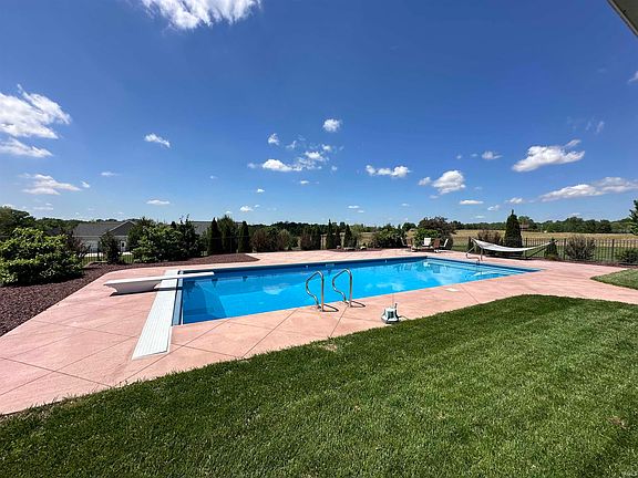 This custom-built home in Jasper, IN offers a true escape to paradise with its expansive 2 acres of land and a variety of luxurious amenities. Its stunning curb appeal is sure to draw you in, while the covered front and back porches provide perfect areas for relaxing and soaking in the scenic outdoors. Inside, the grand foyer welcomes you, with a formal dining room on one side and an office on the other. The great room impresses with its vaulted ceiling, built-in entertainment center, and gas log fireplace. Large windows allow natural light to fill the space, creating an inviting atmosphere. The owner's suite is next to the living room and boasts double walk-in closets and vanities. The walk-in tiled shower and jetted soaking tub complete this delightful retreat. Custom Kitchen Jewel cabinets, granite countertops, an island, and a spacious walk-in pantry will delight the chef. The breakfast nook lends plenty of space to enjoy breakfast while looking over the sparkling, inground pool. Step out back to find a massive covered porch for shade and a saltwater pool with a fun diving board for your summer enjoyment. The pool also features a safety cover. Plenty of concreted areas around the pool for entertaining plus a nice firepit to enjoy an evening of smores. The generous main-level laundry room comes complete with built-in cabinets, countertops for folding, and a soaking sink. The open staircase takes you to 3 additional bedrooms, with one having an ensuite, full bathroom, and a huge storage room. If that were not enough, you are sure to appreciate the finished walk-out basement with a bar area, huge family and rec area, and a full bath. The 3-car attached garage lends plenty of space for your boat and additional vehicles plus a bonus spot for yard