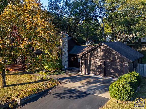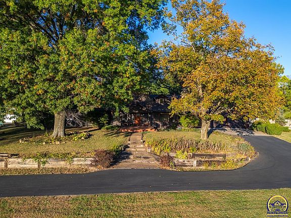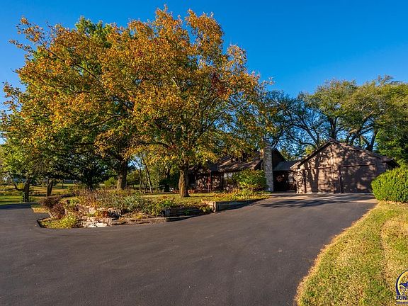 Open Sunday 1-2:30pm. Do you have BIG projects going on? This 58' x 38' heated, plumbed, and air-conditioned laboratory + home office w/ 3rd bath (zoned RA1) is someone's most extravagant dream come true. And, oh by the way (!!!), sheltered by mature shade, there's a lovely home on 5+ pretty acres with a beautifully maintained pond for show. Lots to love about the house, including red oak flooring, bullseye woodwork, 6-panel doors, plenty of windows, sheltered front and back decks with nice views, thoughtful extra storage, and more. The LR fireplace is a super-efficient direct-vent gas insert that uses outside air. Buried electric service, 2 meters. Natural gas at the house. Leased propane (Prairie Band), two 200-amp electric panels, and zoned HVAC for the outbuilding, which was used as a workshop for repairing electron microscopes. The laboratory's flooring is extra thick, the garage door is extra tall, and there is a 5,000-pound capacity hydraulic platform lift just outside its door. All of this at a spot that feels very remote and quiet inside, even though it's on a busy corner — think: quick snow removal almost guaranteed!