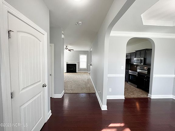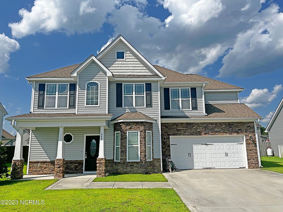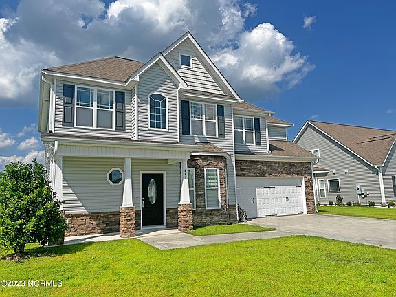 Welcome to Carolina Plantations! A well-established neighborhood centrally located in Jacksonville, NC with NO CITY TAXES! Upon arriving, you are welcomed by a spacious covered front porch with mature landscaping. Entering the home, you are greeted by a view into the main living area, formal dining, kitchen space and stairway access to the secondary floor. Within the main entry, features a powder room/half bath for conveniency and coat closet. Directly right, boasts a formal dining space including a bay window for natural lighting and laminate flooring. Moving forward from the dining, step into the spacious kitchen what features tons of cabinetry, stainless steel appliances, granite countertops, custom backsplash and wrap around peninsula that overlooks the breakfast nook! From the nook, you have slider-door access to the back yard space and garage access for convenience. Check out this main living area! Plenty of space for the whole family, entertaining guests or cozying up next to the fireplace during the winter. Heading up stairs you are welcomed by an arch-top window in the hall allowing natural lighting to illuminate the area. the 2nd floor features a full bath, laundry space, 3 guest rooms (one with french doors) and the Primary Suite. This Suite boasts trey ceilings, tons of natural lighting, an add-on sitting area and french doors entering the bath area. This space is sure to please with double vanity sinks, soaking tub, separate standing shower and private toilet room. But thats not all! Attached to the bath area is the primary 10 x 10 walk-in closet! Check out the size of this backyard for all of your outdoor activities. Whether you are entertaining, BBQ'ing or just relaxing, enjoy! This home is close to schools, shopping, beaches, military bases and much more! Schedule your tour today!