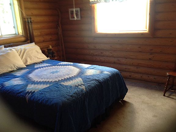 Log home in beautiful country setting. Nearly 2 acres with 720 sq. ft. horse barn, and 180 sq ft. lean to and arena. No CCR's! Plenty of room for garden and animals. 3 car detached garage conveniently connected to entrance by breezeway. Front porch leads you to entrance and great room, with beautiful fireplace, dining area and log staircase. Updated kitchen boasts beautiful blue pine cabinets, pantry, eat in area and tile flooring. Relax on back porch accessible from living area. Updated bathrooms. Upstairs bedrooms are a great size with large closets and bathroom. Electric zonal heating in every room. Walkout basement has a large family room with wood stove ceiling fans, bathroom and bedroom. Sliding doors lead out to patio and fenced backyard with grass, fruit trees and dog kennel.