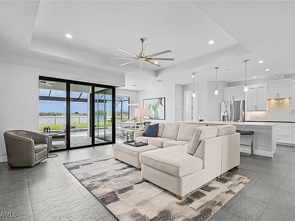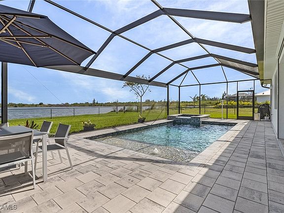 Welcome to this stunning lakefront property in the heart of Cape Coral, where modern sophistication meets serene outdoor living. NOT IN A FLOOD ZONE! Impact Windows and Storm Smart electric shutters for lanai! This beautifully designed, custom-built in 2020, 3-bedroom+den, 2-bathroom home offers an open floor plan that maximizes space and comfort, featuring tray ceilings and oversized sliders that frame breathtaking views of the enchanting lake. Stepping through the front door you will immediately see the gorgeous outdoor view of your backyard retreat. Continue forward into the spacious living area, complete with electric fireplace, and 90 degree sliders that open up entirely to the outdoor lanai, setting the perfect ambiance for relaxation or entertaining. The gourmet kitchen boasts stainless steel appliances, oversized island with overhang for seating, exquisite granite countertops, as well as a built-in wine cooler, making it a chef’s dream. Enjoy your meals in the adjacent dining area or take your gatherings outdoors to the covered lanai, where you can unwind while overlooking your fenced backyard oasis, complete with a heated saltwater swimming pool and hot tub. The luxurious master suite offers two walk-in closets and an en-suite bath that is truly a retreat, featuring modern finishes, dual vanities, freestanding tub, and wraparound shower. Two additional spacious bedrooms provide flexibility for family and guests, as well as an added den that would make a perfect home office. Enjoy the convenience of a two-car garage, direct generator hookup to electric panel, and an outdoor entertainment area perfect for hosting summer barbecues or simply enjoying the sunny Florida lifestyle. Situated on a quiet street, this home is just moments away from a multitude of restaurants, shopping, cultural attractions, and nearby beaches, making it ideal for families and commuters alike. Low assessment balance! Don’t miss the opportunity to make this amazing property your own SW Florida oasis. Experience the best of Cape Coral living with scenic surroundings and waterfront access right at your doorstep! Schedule your private showing today!