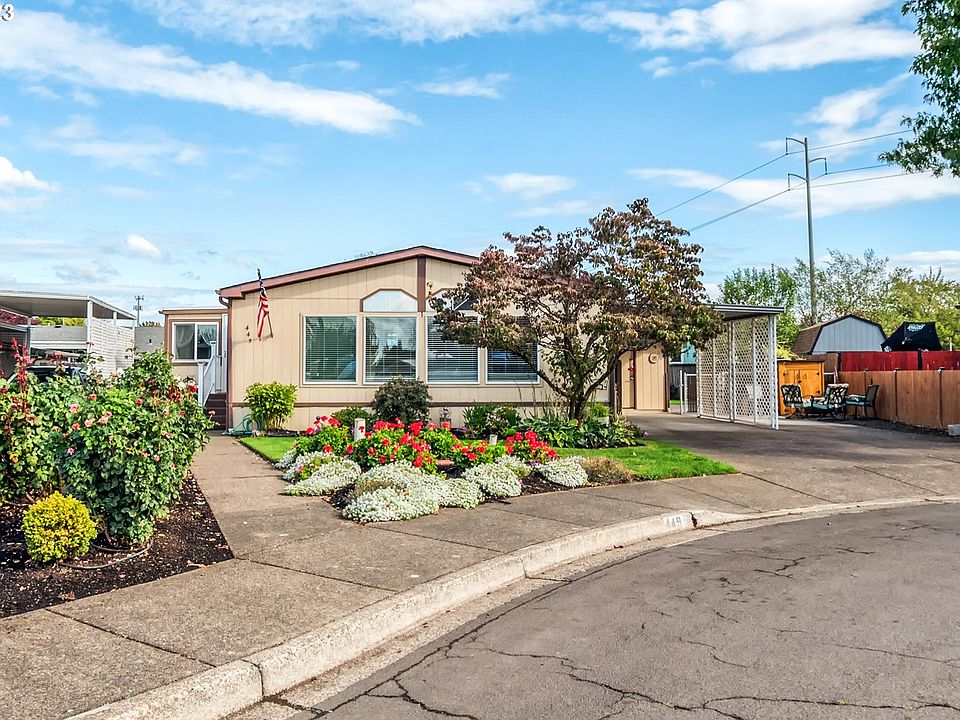 Experience the epitome of comfortable living and convenience in this meticulously maintained manufactured home nestled in the highly desirable Scotts Glen neighborhood within Lochaven mobile park. With 2 bedrooms, 2 baths, and vaulted ceilings w/ fans, this home exudes a spacious ambiance. The kitchen features stainless steel appliances, built-in microwave w/ an eat bar. Separate laundry are w/ closet. Owners bed w/ walk-in closet & bathroom. Outside, a fenced backyard offers security and peace w/ lush green grass and newly stamped backyard patio. Additionally, a covered carport and storage shed enhance practicality. This property is a true haven for those in search of a serene escape with contemporary amenities within a well-established community. Enjoy added bonuses like a fridge, washer/dryer, and TV in the living area with a reasonable offer. Plus, benefit from recently installed upgrades including a new heat pump and A/C, as well as a freshly stamped patio in the backyard. Don't miss the opportunity to make this your dream home!