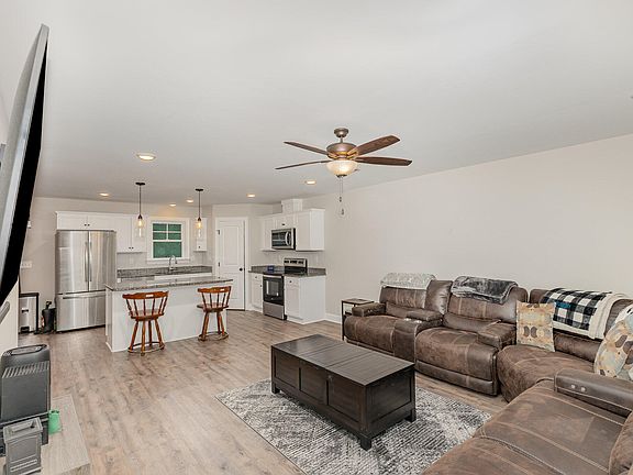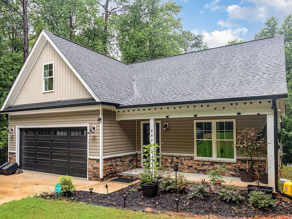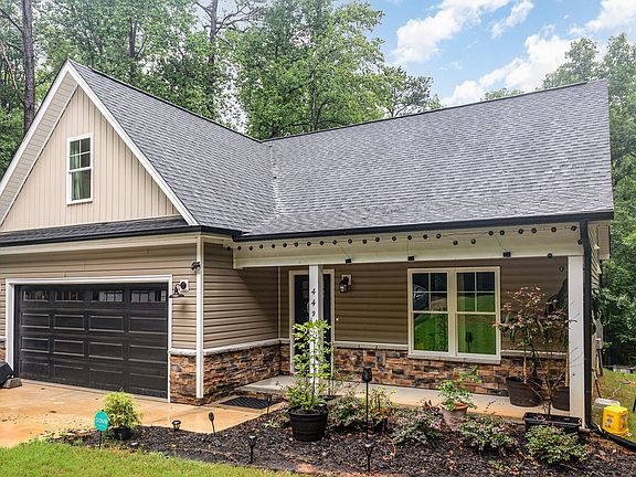 Enjoy the tranquility of a private 345-acre lake resort, complete with a golf course, tennis courts, and a swimming community on a beautifully wooded corner lot! This home features a luxurious first-floor primary suite and stylish hardwood flooring throughout the main living areas. The kitchen has granite countertops, custom white painted cabinets, stainless steel appliances including a smooth top range, a white center island with a breakfast bar, accent pendant lights, and a corner walk-in pantry. It opens to a dining area with a sliding door leading to a rear grilling deck. The primary suite boasts plush carpet, a ceiling fan, and a spacious walk-in closet that could double as a home office! The ensuite bath includes a dual vanity with granite countertops, custom white cabinets, a walk-in shower, and a linen closet. The family room offers hardwood-style flooring and a ceiling fan. Upstairs, a large bonus room with a vaulted ceiling and unfinished walk-in.