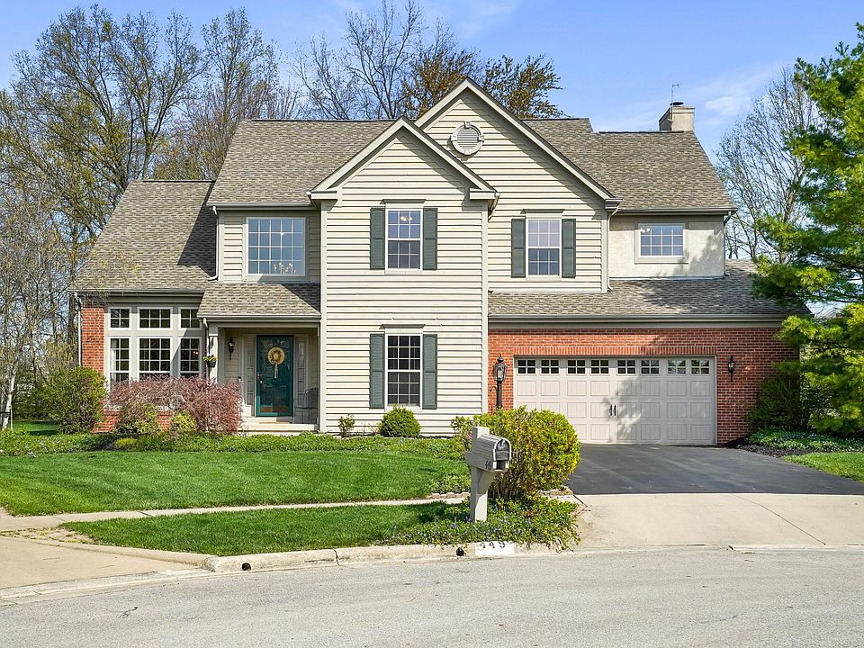 This fabulous custom built two story by P.E. Taylor Homes is located at the end of a cul-de-sac. Nestled on almost one-half acre, with great views of the beautiful back yard and paver patio. The yard has plenty of space for recreation and is wooded along the perimeter for privacy. The spacious family room has a two story wall of glass windows, fireplace, plus a homework station! Other features include: stainless appliances, granite counters, center island with seating for five, first floor laundry, vaulted ceiling in the Living Room and in the Owner's suite, new carpet, updated HVAC in 2016, roof 2019, I-Wave air purification system 2020 and access to multi-use pathway a few homes away. This home is immaculate and well maintained. A perfect place to call home!