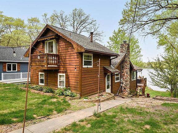 Lake life within an hour of the Twin Cities? Look no further! This move-in ready home has maximum garage & outdoor space. 50 feet of lakeshore with your own beach. Lake Julia offers amazing views. Immediately upon entering the home you are greeted with a rock fireplace, open concept kitchen, great living room space, double patio sliders out to the deck with full lake views. Upstairs, the primary bedroom has a washer & dryer set and 1/2 bathroom. Don’t forget about the perfect outdoor sitting area right off the primary bedroom. On the main level, one bedroom connected to the 3/4 bath. The basement has additional family room space & office. Basement also has a door walking out to small a patio area under the deck. Lots of storage in the utility room & even your own wine cellar! Small storage shed for more easy storage access right before heading over to back lot. The back lot features a 3 car garage/workshop and garden. Unlimited opportunities await! Dock is staying