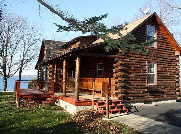Private log cabin on 115 feet east shore Seneca Lake with good sized rooms, stone fireplace, woodstove and workshop in basement; Large 3 bay detached garage; sturdy dock and boat lift. About 10-15 steps to beach. Land extends back 1,400 feet to East Lake Road.